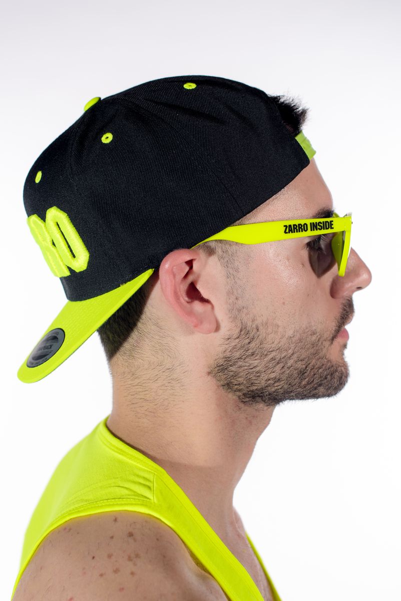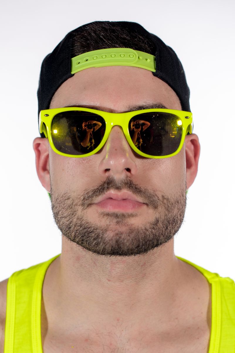 Per nascondere le occhiaie o per la sera in Disco: occhiali da sole giallo fluo con lenti a specchio.