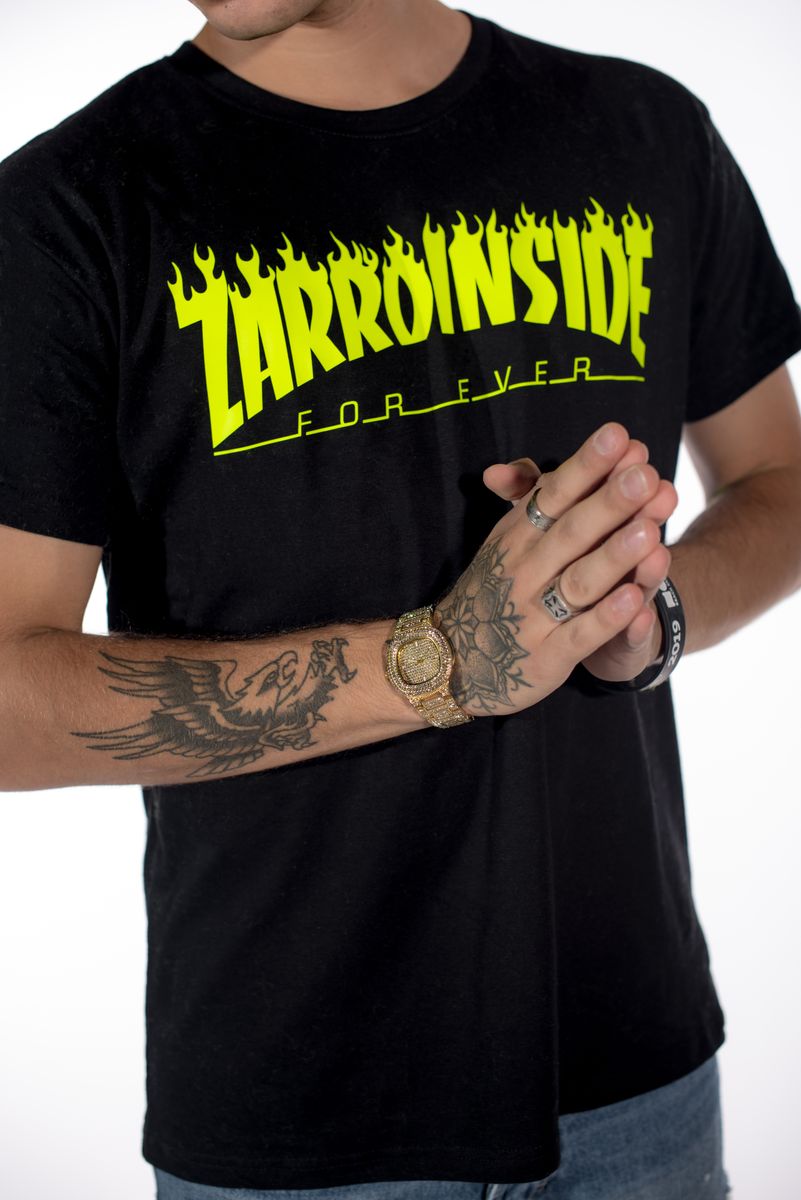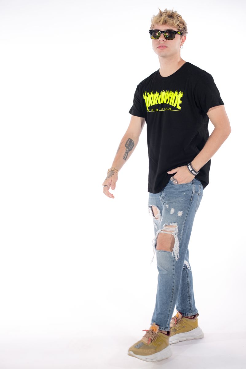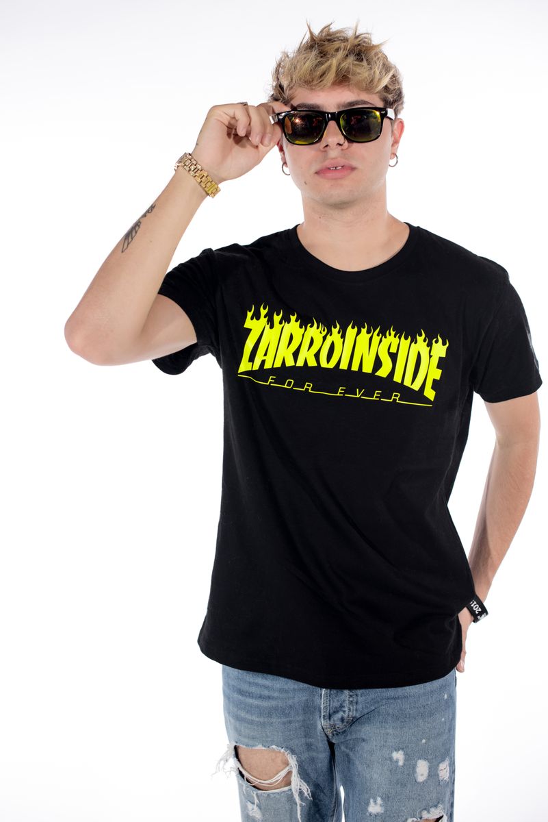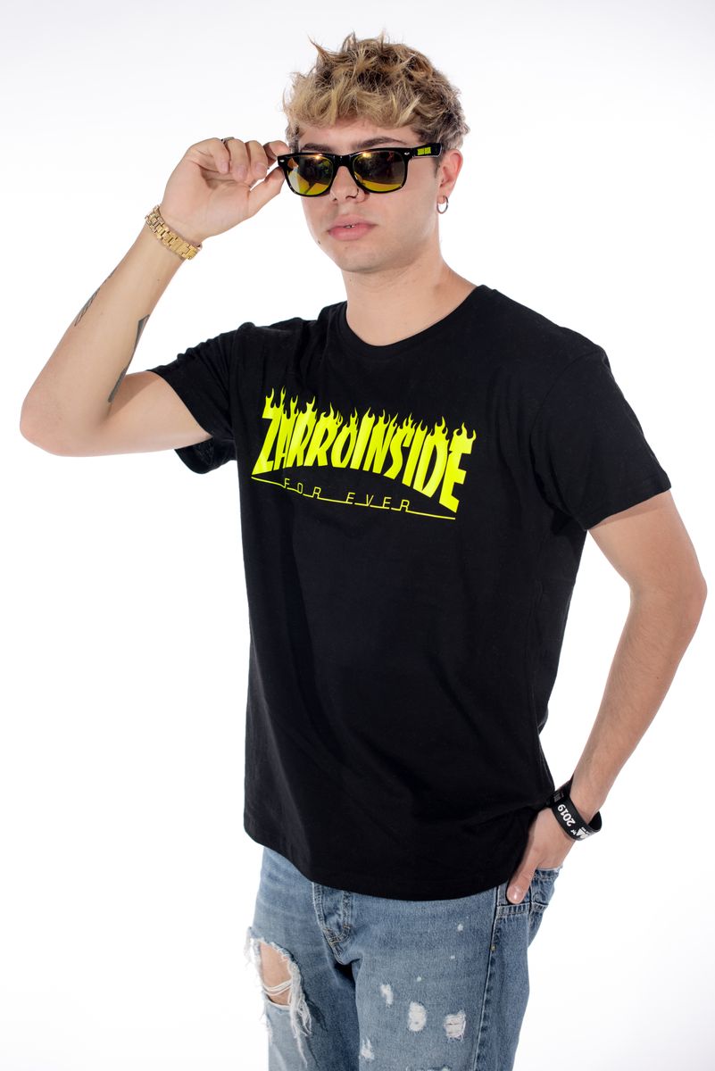 T-shirt nera con stampa giallo fluo per essere i capi della cumpa.